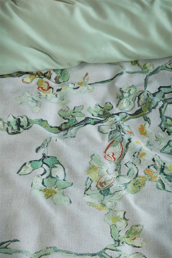 Bedding House is met trots de officiële partner van het Van Gogh Museum Amsterdam. De unieke samenwerking tussen het Van Gogh Museum en Bedding House resulteert in een zeer speciale bedtextiel collectie. Elk dessin is geinspireerd op één van de schilderijen van Vincent van Gogh. Dit dessin is gebasseerd op het schilderij Almond Blossom, wat Van Gogh schilderde naar aanleiding van de geboorte van zijn peetzoon. Het bestaat uit een rustigere kleursamenstelling met de bekende amandelbloesem takken als eye-catcher op een grijze achtergrond. Met het onderwerp, de scherpe omlijningen en de plaatsing van de boom in het beeldvlak liet Van Gogh zich inspireren door de Japanse prentkunst. Door het romantische dessin en de rustige kleuren zoals lichtgroen en creme kleuren past het dekbedovertrek goed in een romantische of klassieke slaapkamer.